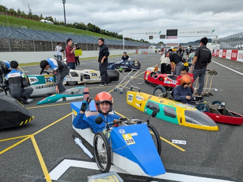 この大会は自作の一人乗りフレーム(車体)にホンダ製4サイクル50ccエンジンを載せ、「1リットルのガソリンで何キロ走れるか」を競い合います。競技内容は180ccの燃料で規定周回数(16389.68m)を平均時速25km/hにて走行し、消費した燃料から燃費を算出して順位を決めるものです。また、昨年から燃料がガソリンだけではなくカーボンニュートラル燃料が追加され、その燃料のクラスに移行したチームが増えたため、当校が参加する大学・短大・高専・専門学校ガソリンクラスの参加台数が今年は25チームと減っていました。さらにガソリンのクラスは今大会で終了とのアナウンスがありました。
