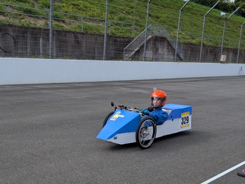 スタート順は中学生クラス、高校生クラス、大学・短大・高専・専門学校クラス、一般クラス・・・となっており、1日目(練習走行日)は台風の影響と思われる雨の影響で高校生クラスまでで走行中止になりました。練習走行日でデータ収集を行って決勝に挑むのですが、決勝は一発勝負になってしまいました。2日目(決勝日)は天候も回復し予定通りの日程で行われました。走行パターンなど前日に確認することができなかったため、昨年度の走行パターンを参考にしながらの走行となりました。結果は大学・短大・高専・専門学校ガソリンクラス25台のエントリー中、完走10台で当校は339.984kmという記録で6位になり、燃費は過去の記録を更新できませんでしたが過去最高順位となりました。