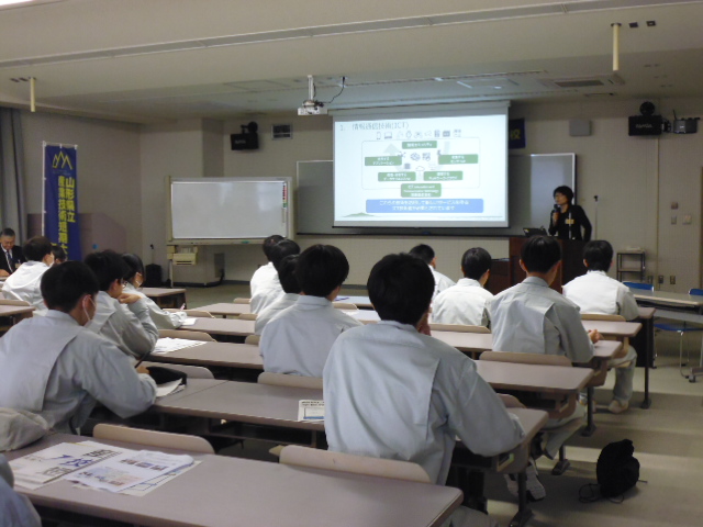 はじめに、本校情報通信システム科の教育内容や特色について説明を行いました。2年間で学んでいく内容や、取得できる資格、卒業後の具体的な就職先や職種、本校の魅力・強みである習熟度別教育や少人数教育、山形大学編入などのステップアップの道があることなどについてお話ししました。