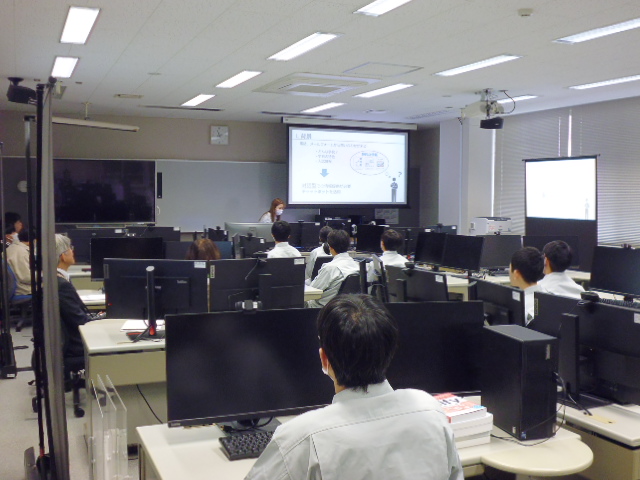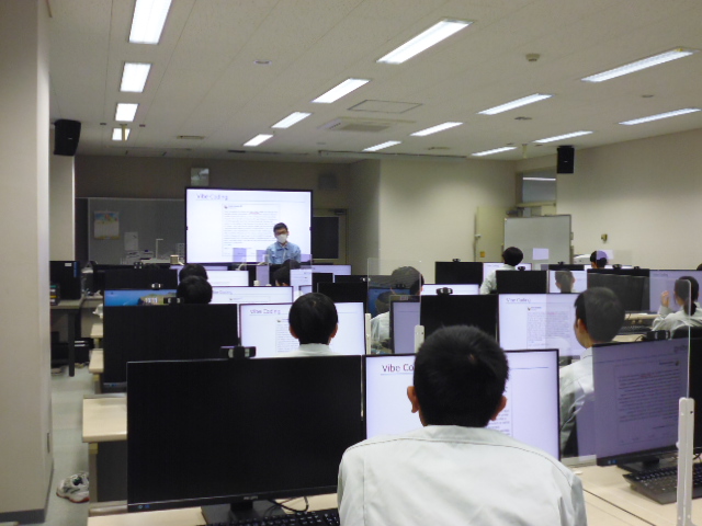 次に、学生が授業で使用している実習室に移動していただき、2班に分かれて、2年生が現在取り組んでいる卒業研究の紹介と、模擬授業(システム開発における生成AIの活用)を受けていただきました。