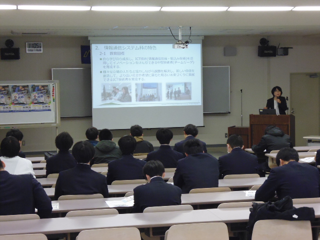 はじめに、本校情報通信システム科の教育内容や特色について説明を行いました。2年間で学ぶ内容や取得できる資格、卒業後の具体的な就職先や職種、本校の魅力・強みである習熟度別教育や少人数教育、山形大学編入などのステップアップの道があることなどについてお話ししました。