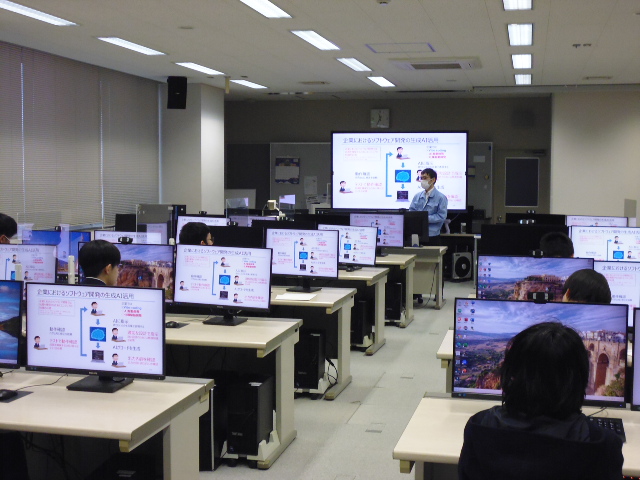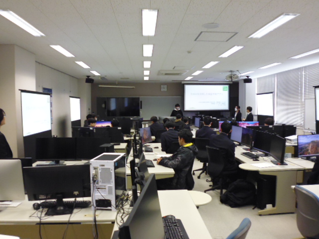 次に、学生が授業で使用している実習室に移動していただき、2班に分かれて、2年生が現在取り組んでいる卒業研究の紹介と、模擬授業(システム開発における生成AIの活用)を受けていただきました。