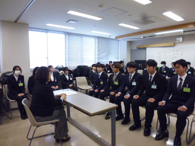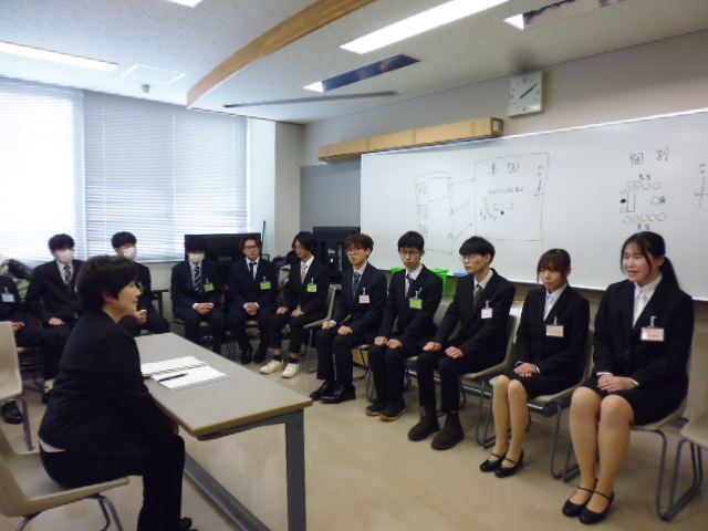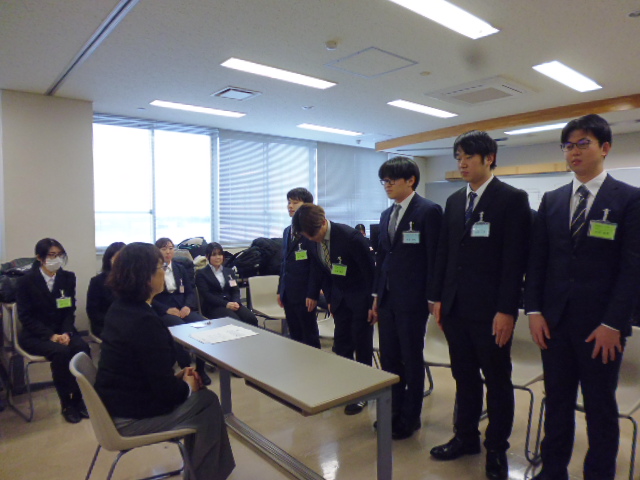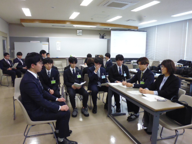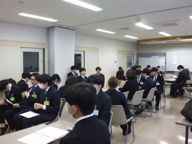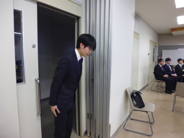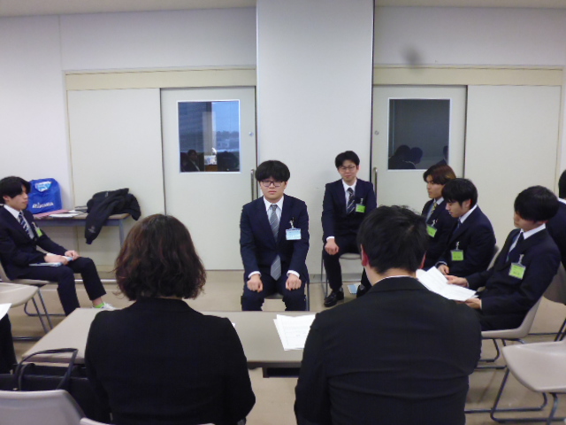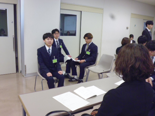面接の目的、どういうところが見られるか、入室から退室までの一連のふるまいについて学んだあと、集団と個別、両方の面接の形で、応募者と見学者に分かれて、全員で演習を行いました。