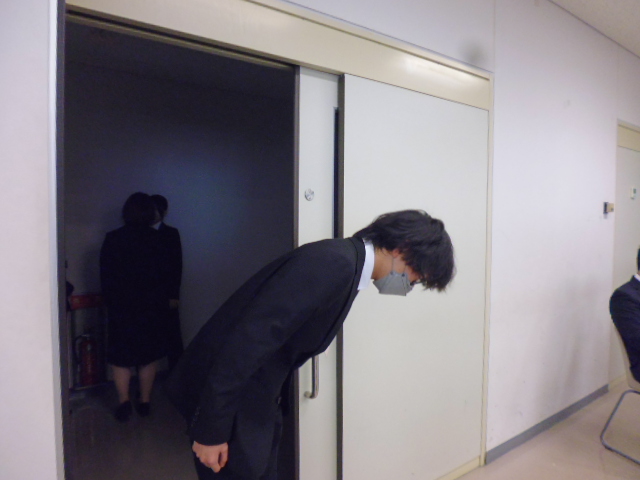 序盤は立ち姿や声が頼りなく見えた学生たちでしたが、指導講師や見学者から良かったところや気づいたところを指摘されたり、注意を聞いて繰り返し練習していくうちに、後半に差しかかるころには声もはきはき、お辞儀もしっかりできるようになっていきました。